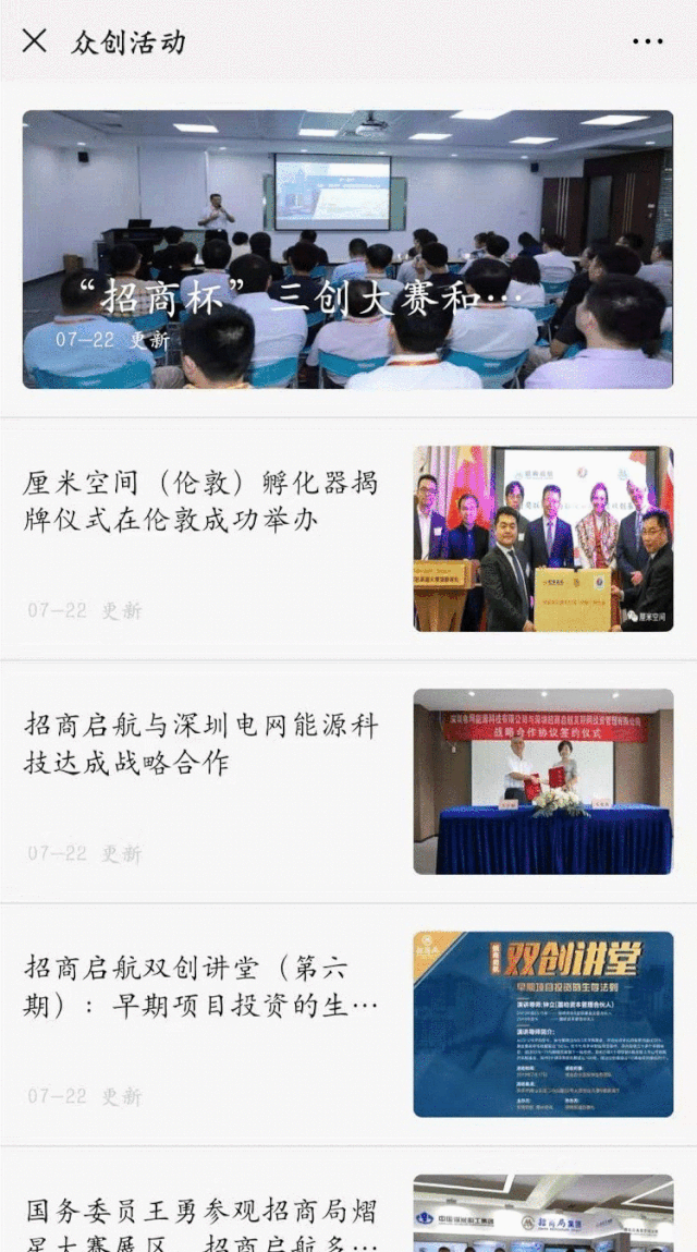 通过微信公众号可实现众创活动,招商杯大赛,产业创新对接的查询和交互。